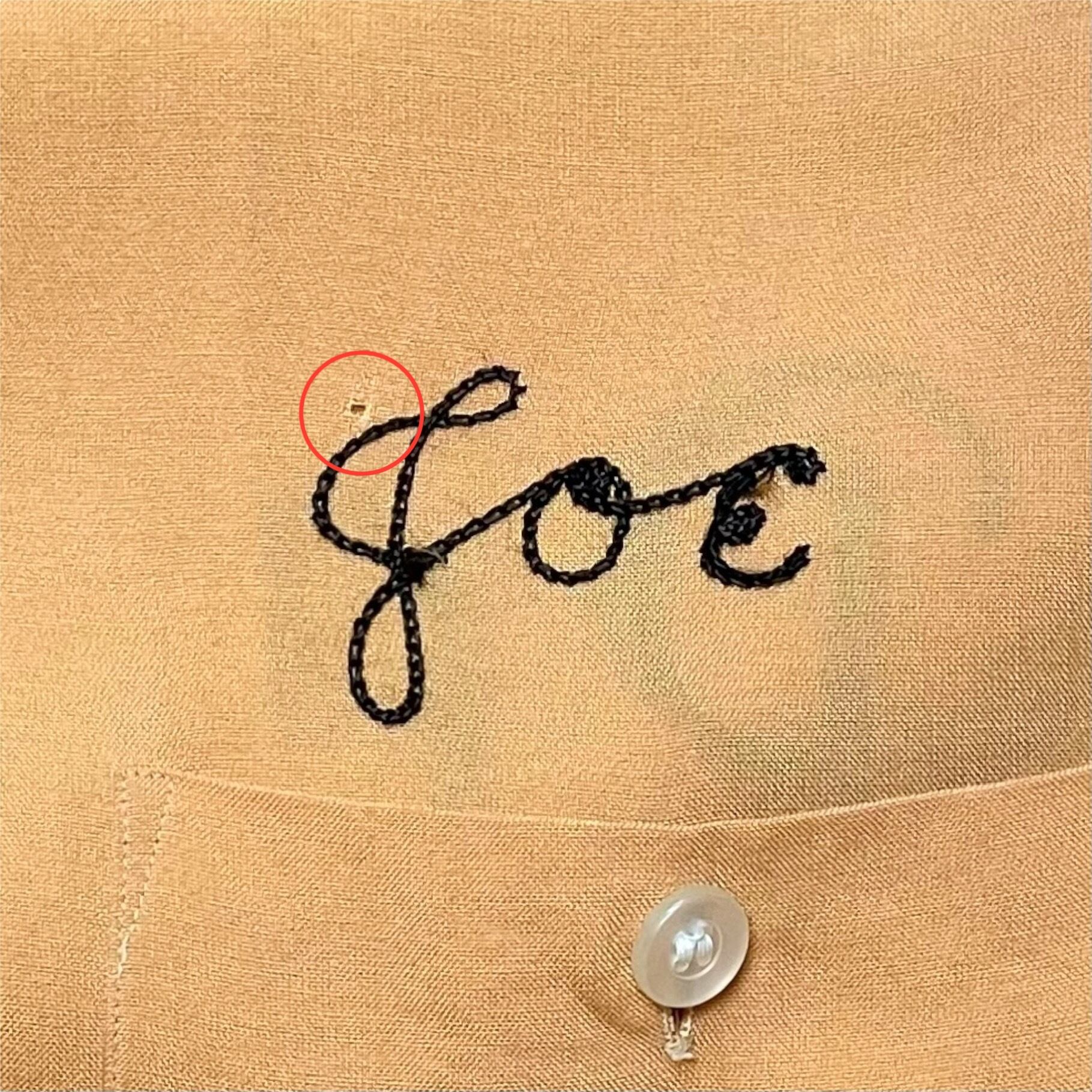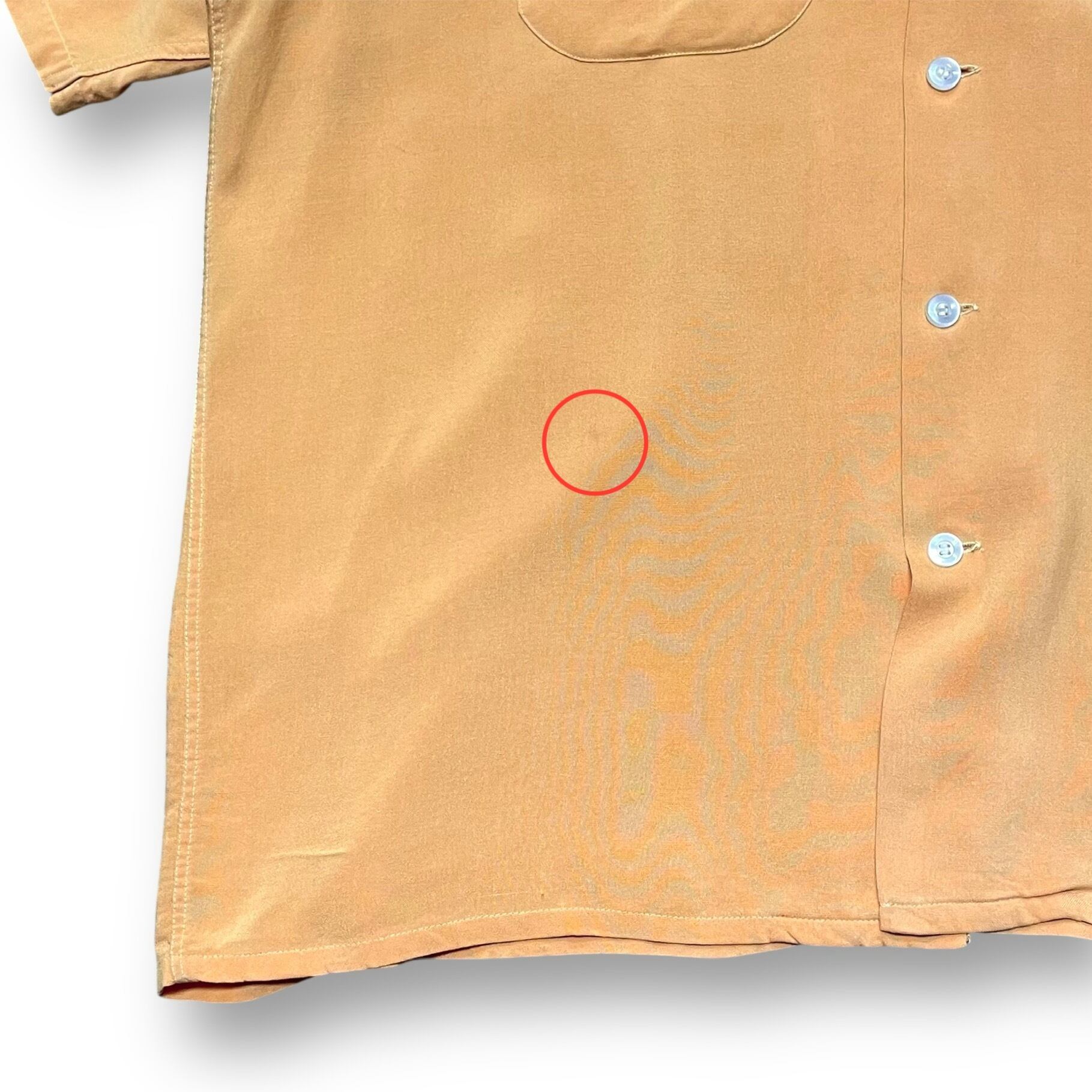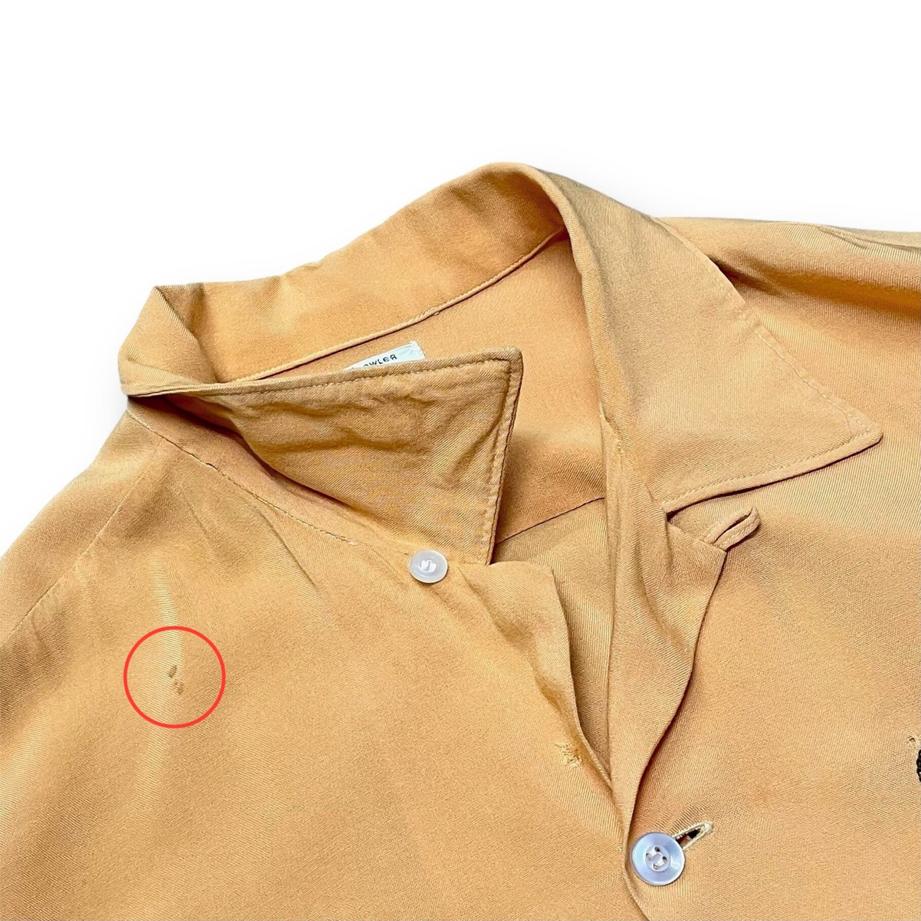 ・背面裾付近と背面左肩チェーンステッチ下と左胸チェーンステッチ上にピンホールあり。